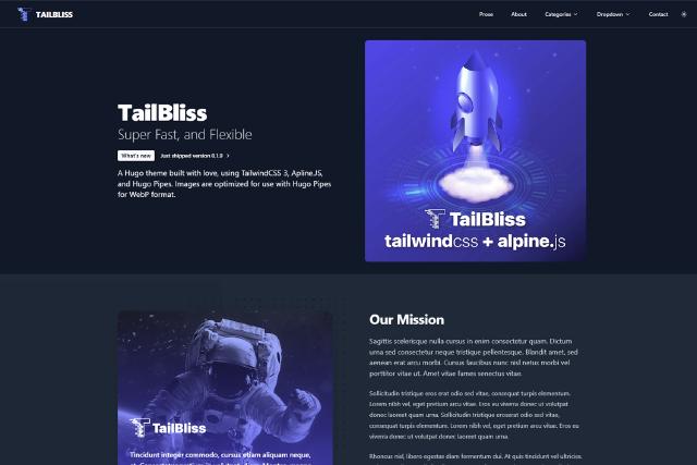 TailBliss is an Hugo Starter with Tailwind CSS 4.1 and Alpine.js with light and dark modes. Submitted for Hacktoberfest 2022.